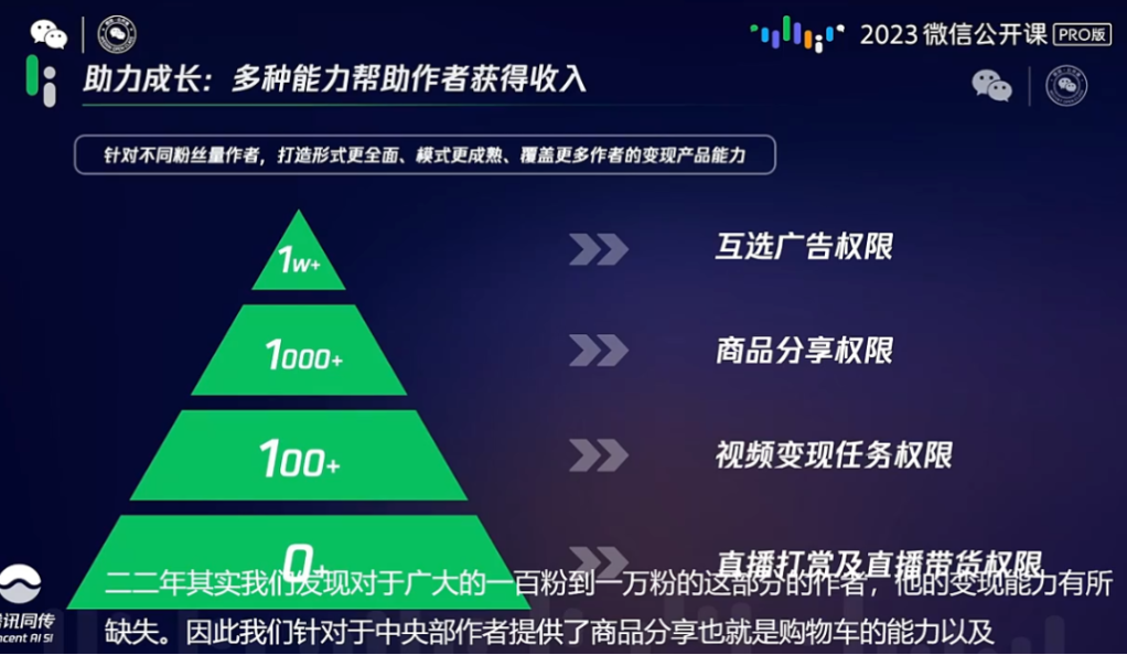 2022年,视频号团队针针对不同粉丝量作者,视频号打造了形式更全面、模式更成熟、覆盖更多作者的变现方式: