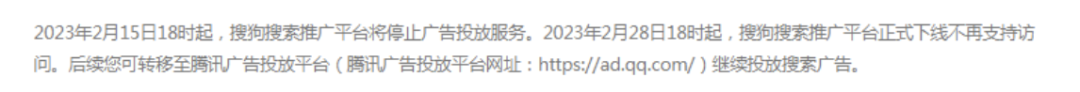 熟悉搜狗搜索广告的朋友都知道,搜狗旭日平台近期正逐步迁移到腾讯广告投放平台上。通知称自2月15日18时起,搜狗搜索推广平台将正式停止广告投放服务。