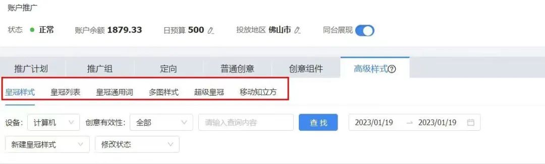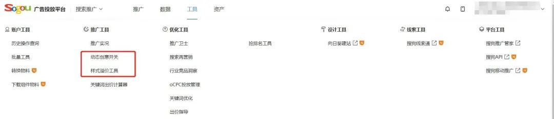 第二大差异点,搜狗旭日平台的基础创意相对比较机械化,智能化程度低。稍微智能一点的是,后台工具里有同台展现、动态创意开关和样式溢价这些小功能。