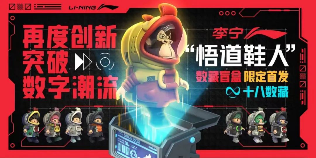 第三次,2023年1月,李宁又拿4102来做文章了。他跟国内一个流量比较大的数字藏品平台叫十八数藏,合作推出了“悟道鞋人”,就是把鞋拟人化的一个数字藏品系列。该数字藏品以悟道鞋款为灵感,将无聊猿形象融合解构,发行8款拟人化鞋人,在十八数藏上发售,也是结合了4102的形象。这也是国内首款以拟人化形态发行的潮流衍生数字藏品。所以我觉得他们真的把购买NFT当成一个长线投资,它不断在进行二创。