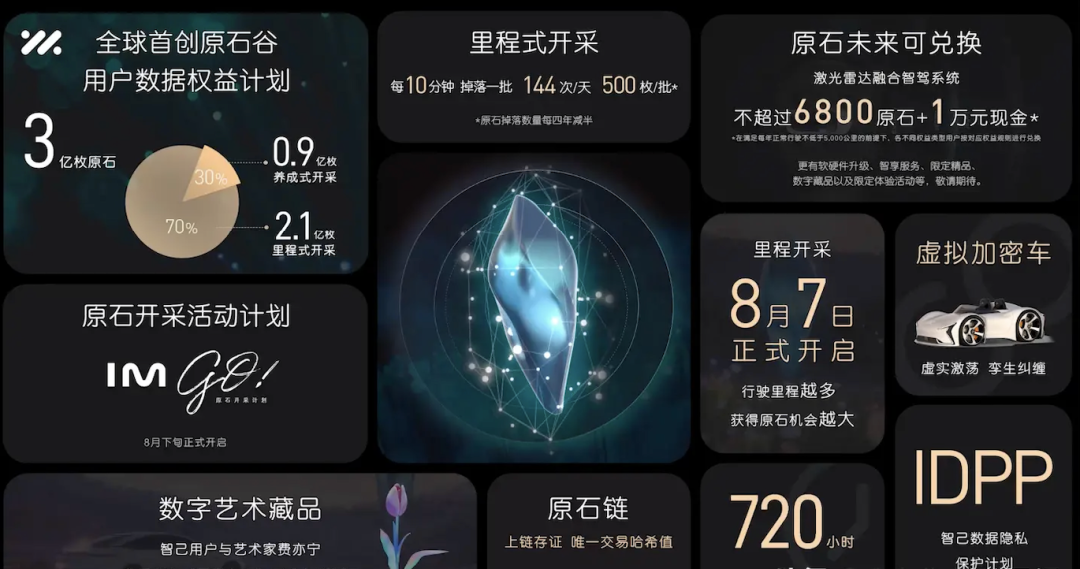 智己汽车做的原始股,就是你买了我的汽车之后,在开车的过程当中会采集你的里程数据。通过销售特定的行车记录仪,以进行地图数据采集,同时为车主赚取奖励。这是“原石谷用户数据权益计划”。只要是智己汽车的车主,在激活车机且同意授权数据后就有资格参与“原石谷用户数据权益计划”,没有额外的入门门槛。用户使用自己的行车数据就可以获得原石奖励。原石上限是3亿枚,会在数年的时间内慢慢投放完毕。