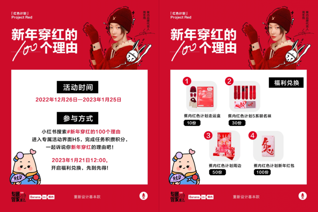 今年是蕉内「红色计划」的第五年,品牌每年都会联动知名设计师打造新年礼盒,不断沉淀品牌的“新年红色”文化。而今年的活动中,小红书为蕉内找到了夯实品牌“新年红色”文化的新路径。