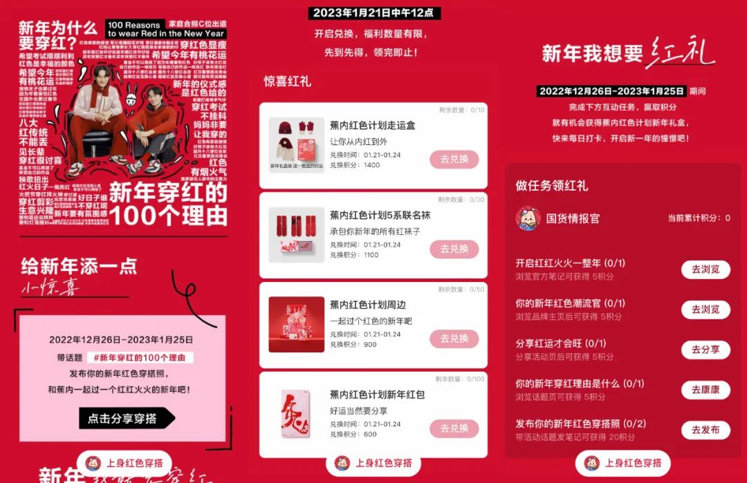 例如,小红书在#新年穿红的100个理由 活动中,联合蕉内上线了“红礼”福利模块,平台用户参与专属打卡活动、完成任务即有机会领取品牌好礼。互动机制的加入,不但丰富了活动玩法,也帮助品牌从初始目标群体向外延展实现破圈传播。