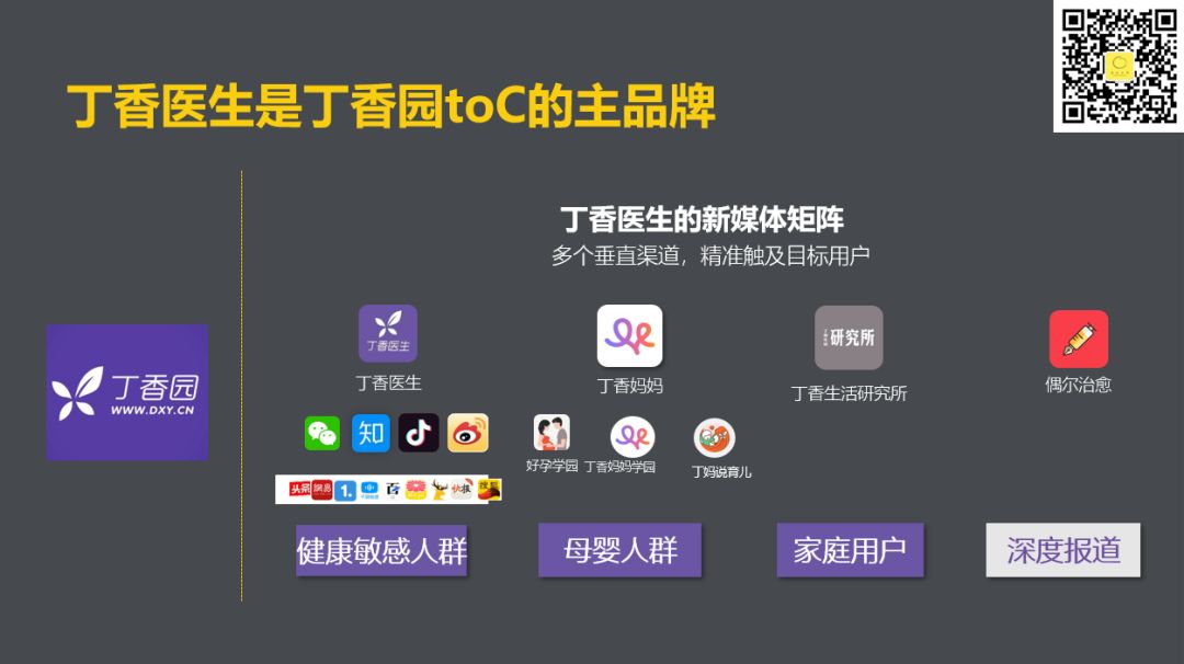 丁香医生是丁香园旗下的TO C品牌。今天大家看到的丁香医生新媒体,仅仅是整个丁香医生的一部分,除此之外,我们还有在线问诊、线下诊所等服务。