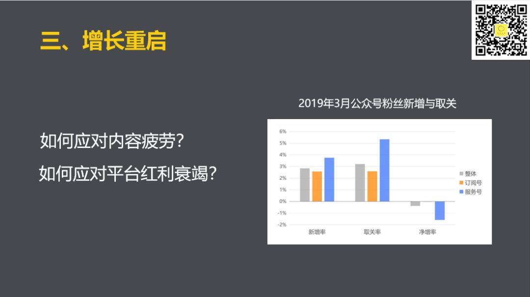 上面这张图,是2019年3月某平台发布的关于微信的一个统计报告,从中可以发现,整个微信公众平台的粉丝新增和取关,其实净增率是负的,所有微信号平均下来是负增长的。