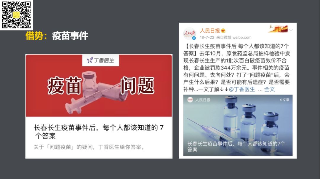 比如今天如果我去推疫苗的科普文章,是没有势能的,然而在疫苗事件发生的时候,势能巨大,这个问题背后,大家有非常多的恐慌和焦虑,大家对疫苗的关注度空前高涨,此时,我们那些库存已久的疫苗知识,是时候发出来了。