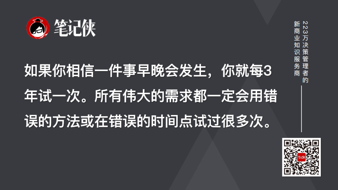 3.如果你相信一件事早晚会发生,你就每3年试一次。所有伟大的需求都一定会用错误的方法或在错误的时间点试过很多次。