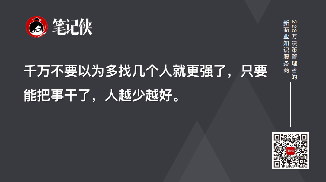 8.管理是反规模效应,这对你的商业决策和组织决策都有影响。千万不要以为多找几个人就更强了,只要能把事干了,人越少越好。