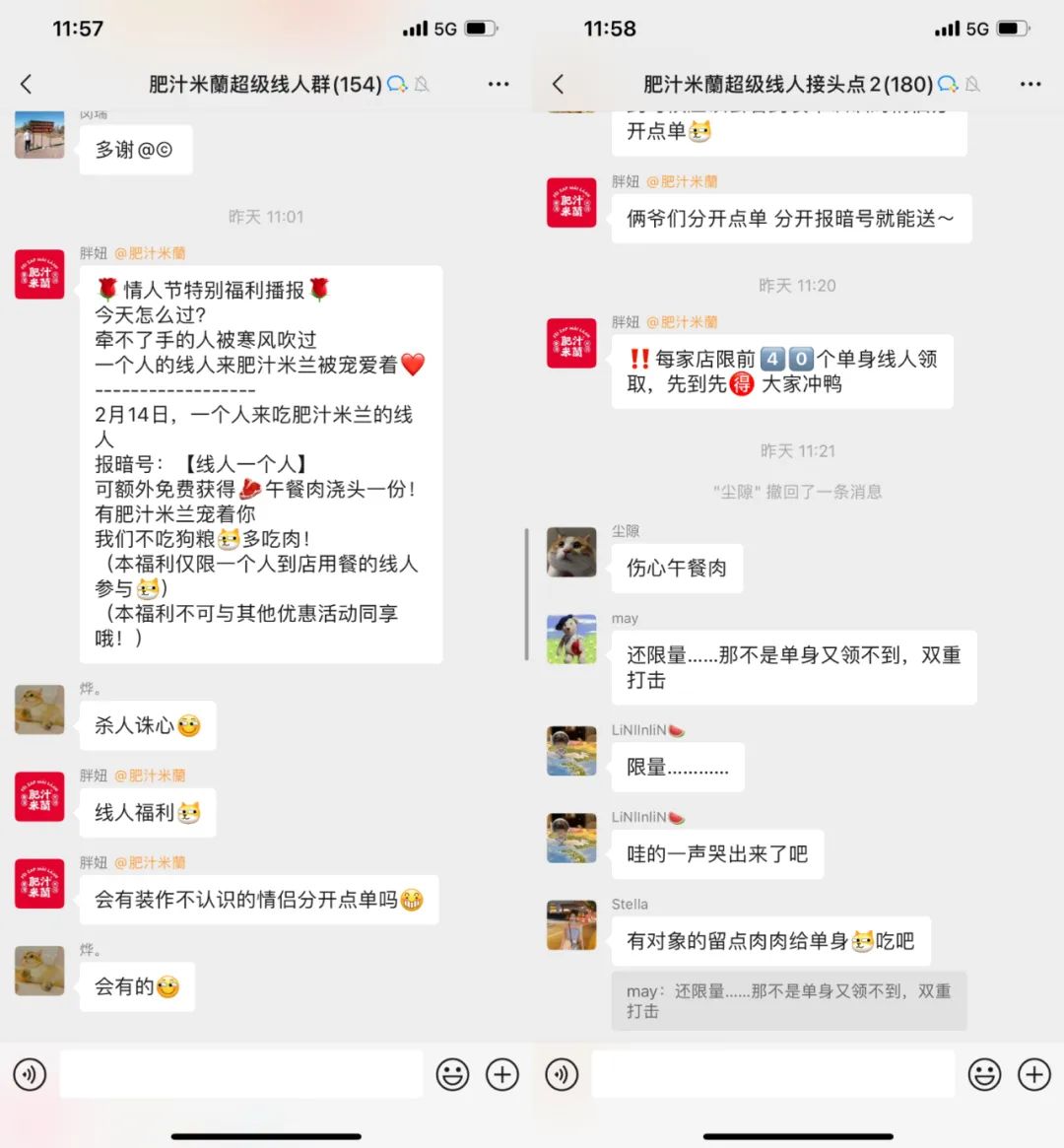 最后,社群的互动消息有问必答,这是整个社群运营中最重的部分。原则上,当公域(如大众点评,外卖双平台)上信息更新恰当且产品不出现重大问题时,不会有过多问题在群内提问。如果这类问题出现了,可以促进其他部门优化展示信息。毕竟私域不是客服,不要让用户养成因为“懒惰”而提问的习惯,比如可以回复“营业时间可以关注门店大众点评”,“菜品是否售完可以电询门店”等。