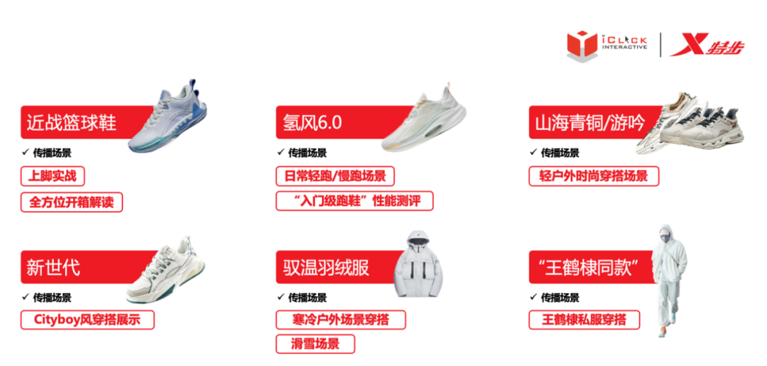 对于不同的产品体系,主打的卖点与传播的场景大不相同,篮球鞋讲究实战与性能,跑步鞋讲究透气与舒适性,它们均适合上脚实战与开箱测评;针对设计感较强的运动鞋来说,主题元素与背后的文化更加重要,更适合穿搭种草等等。爱点击品牌内容策略团队,针对此次特步主推的六款尖货,进行了产品RTB的梳理,根据不同卖点与不同传播场景,有的放矢地进行传播体系搭建。