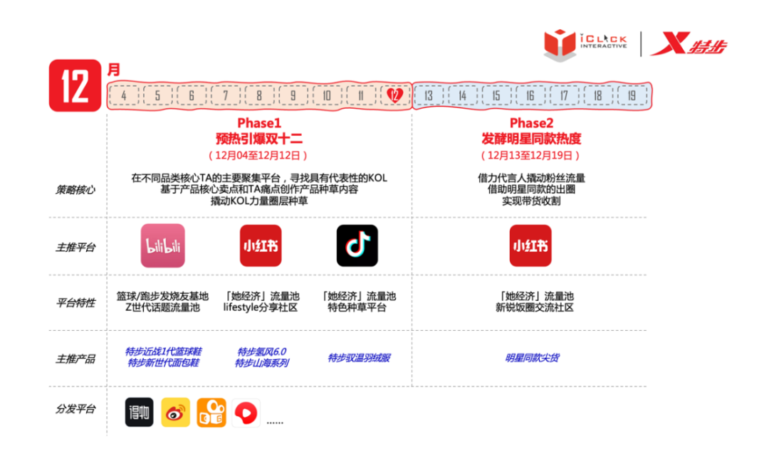 根据不同的TA、卖点、场景,以及三大平台的用户属性,爱点击为特步制定专属传播矩阵,有效覆盖双十二营销节点前后,高效刺激转化。