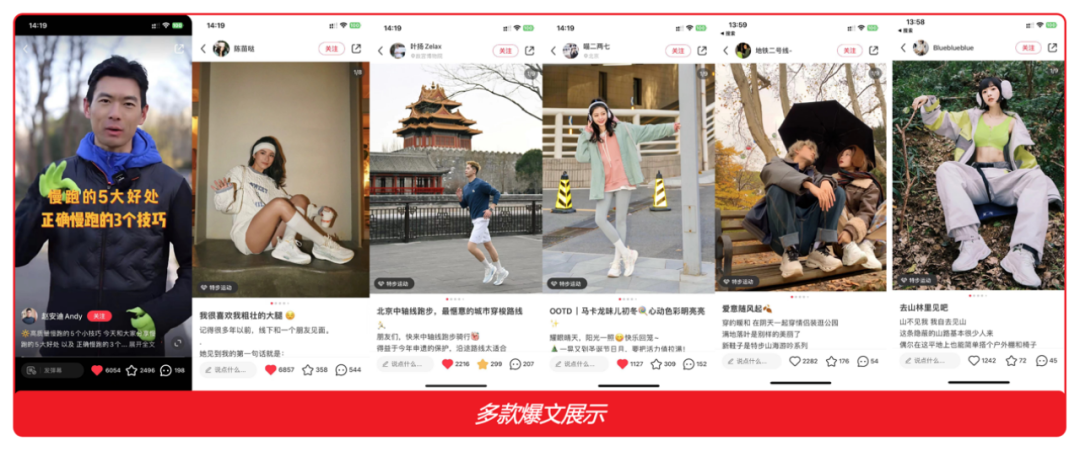 结合小红书平台近期较火的慢跑与露营主题,产出优质图文,以轻运动与轻户外为场景植入,结合自然且生活化的摆拍动作,来展现元气的生活状态和氛围感穿搭,从而放大产品的颜值,除此之外还邀请了跑鞋测评的头部达人,在强调颜值的同时也从透气性、舒适感等多维角度全面包装产品,强化“入门级跑鞋”的定位,拉满用户对品牌好感度。最后,挑选爆款笔记,通过竞价工具收获二次流量导入,打造多篇爆文。