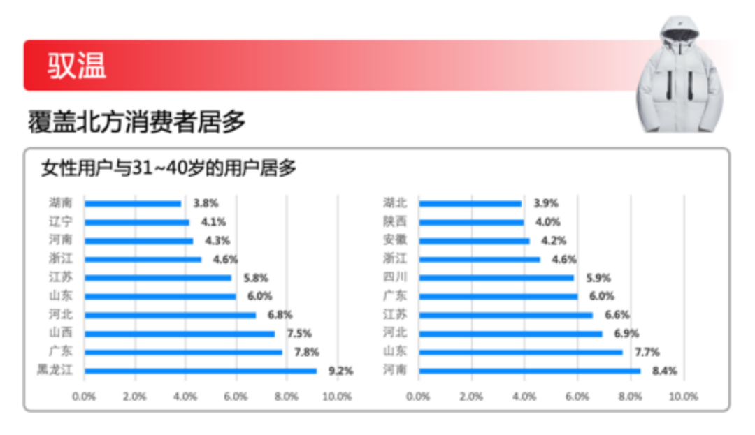 本次投放圈层精准,两位KOL覆盖粉丝人群均以北方地域为主,落地页和购物车组件的带货效果也优于行业表现。抓马搞笑的情侣剧情更符合抖音平台的粉丝视频偏好,视频本身对产品卖点的植入也比较软性且有趣,因此投放KOL的流量优势明显,结合近期大热的滑雪主题,将产品代入滑雪环境,也充分展示了产品的实用性与科技力。