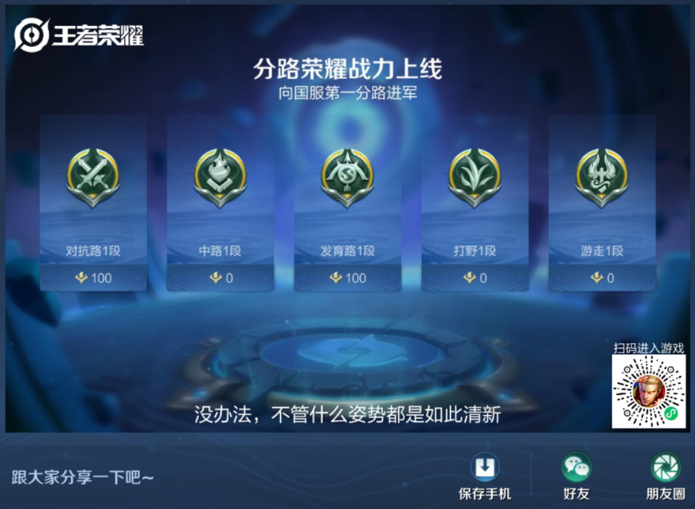 获得了新英雄,新皮肤,或者荣耀战力升级,都会有分享的按钮,当好友看到之后会有一定几率扫码进入游戏进而注册。