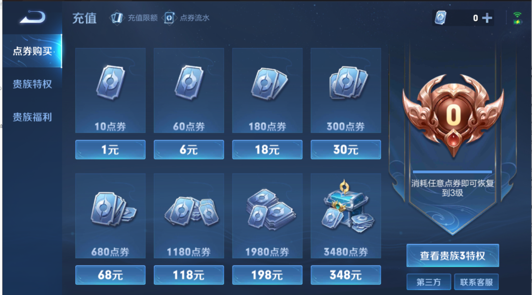 贵族权限在充值界面的右方占据三分之一的位置,很显眼,当玩家充值之后称为贵族的进度在这里很明显可以看到