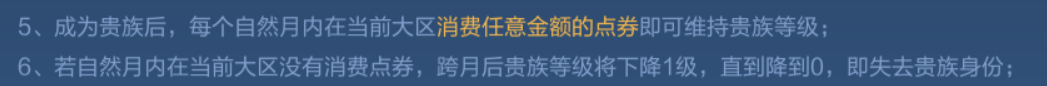 每个自然月在当前大区消费任意金额的点券即可维持贵族等级 贵族1:1元 贵族2:10元 贵族3:50元 贵族4:200元 贵族5:500元 贵族6:1000元 贵族7:2000元 贵族8:5000元 贵族9:10000元 贵族10:18888元 |