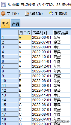 假如这个是用户订单底表数据,我们通过数据来建立一个分析模型: