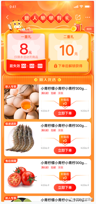 围绕“首单+每单购后即时激励”模式打造,提前锁定新用户认知,引导用户完成0-3单转化。