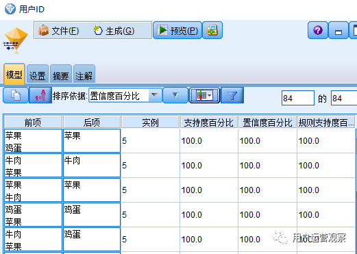 如果用户在购买了苹果和鸡蛋后,下一次购买苹果的置信度是100%(由于实验数据过拟合,所以是100%的概率,真实订单数据的话,置信度越高,表明用户在购买完苹果鸡蛋后,下一单很高概率购买苹果)