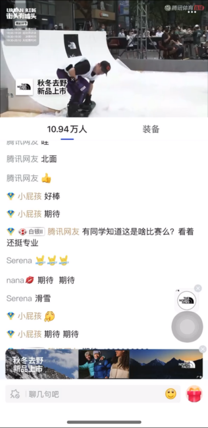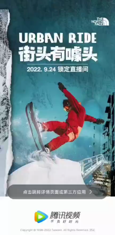 而微信生态的诸多工具,诸如腾讯视频、微信公众号、小程序商城、导购社群等,这些阵地化基建都为品牌营销事件的定制提供了良好的土壤。像是在滑雪运动大热的时候,The North Face自制街头滑雪快闪赛Urban Ride,聚集顶尖滑手挑战坡道障碍,吸引众多滑雪爱好者关注。前期有推荐页卡Banner、弹窗、闪屏、信息流广告等多渠道打通引流,直播期间有腾讯视频&体育边看边买组件,这些都让“一站式转化”成为可能。