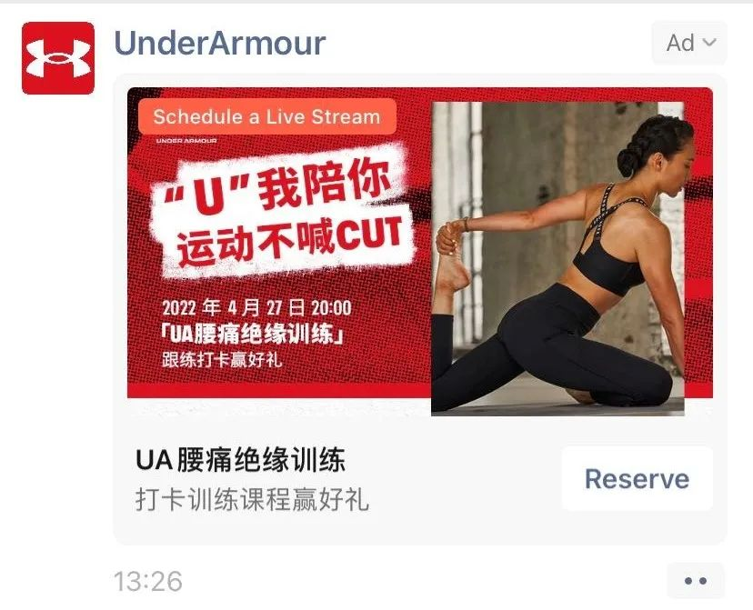 这些都让真正有需求的人聚集在一起,让品牌在直播以外拥有可持续增长的空间。随着居家健身成为新常态,越来越多的消费者开始关注线上健身课。窥见这一需求的UA也及时推出了12场系列健身课程直播,深化目标客群的心智连接。品牌借助朋友圈广告引流直播间,并通过直播间二维码引导入群,后期以导购社群分享、互动PK活动、打卡分享机制等用户关系运营方法,拉动会员人数与粉丝忠诚度提升,实现了用户对品牌信任的可持续增长。