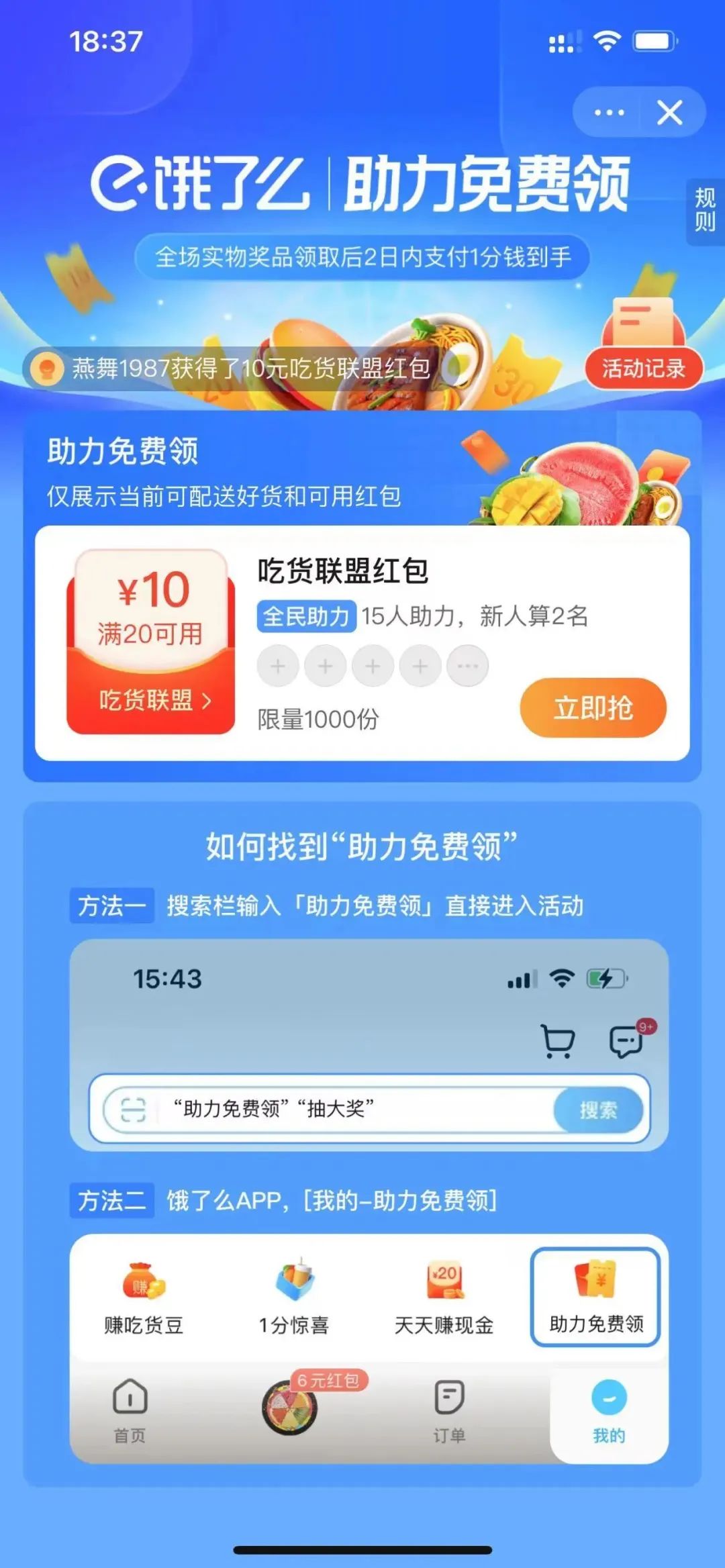a) 助力(15人助力,1新用户等于2个老用户)免费领满20减10的红包,针对时常点外卖的用户。