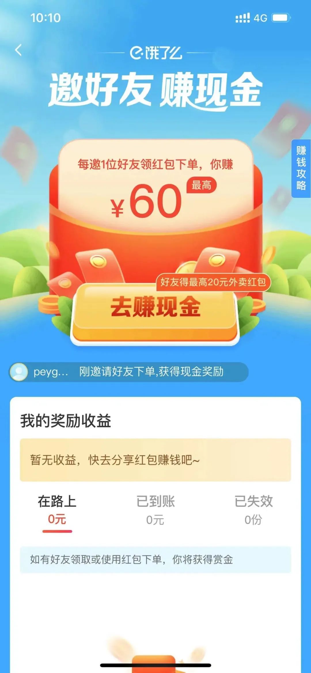 b) 天天赚现金,邀请好友使用红包下单,赚取赏金(可提现,也可抵扣外卖费用),针对不常点外卖,但有投机取巧之心的用 户。