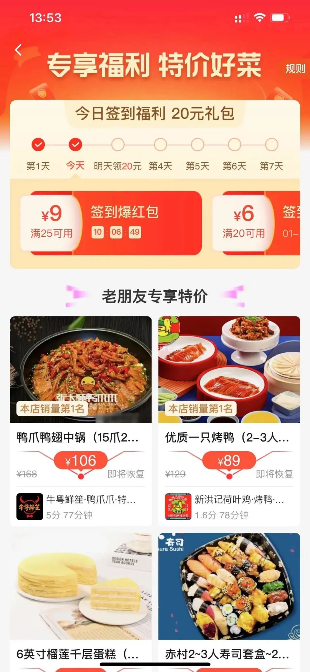 a)七天任务,第一天可领到三张10元左右的限时满减红包,后续六天,每天两到三张6-10元不等的限时满减红包,培养新用户吃饭点外卖的惯性,其实是一种必然,因为10元券吃饭,基本实际花费也就十来块钱,一般来说,对于中等消费群体还是越实惠越好,利用其占便宜的心理,培养餐饮习惯,可谓高明。