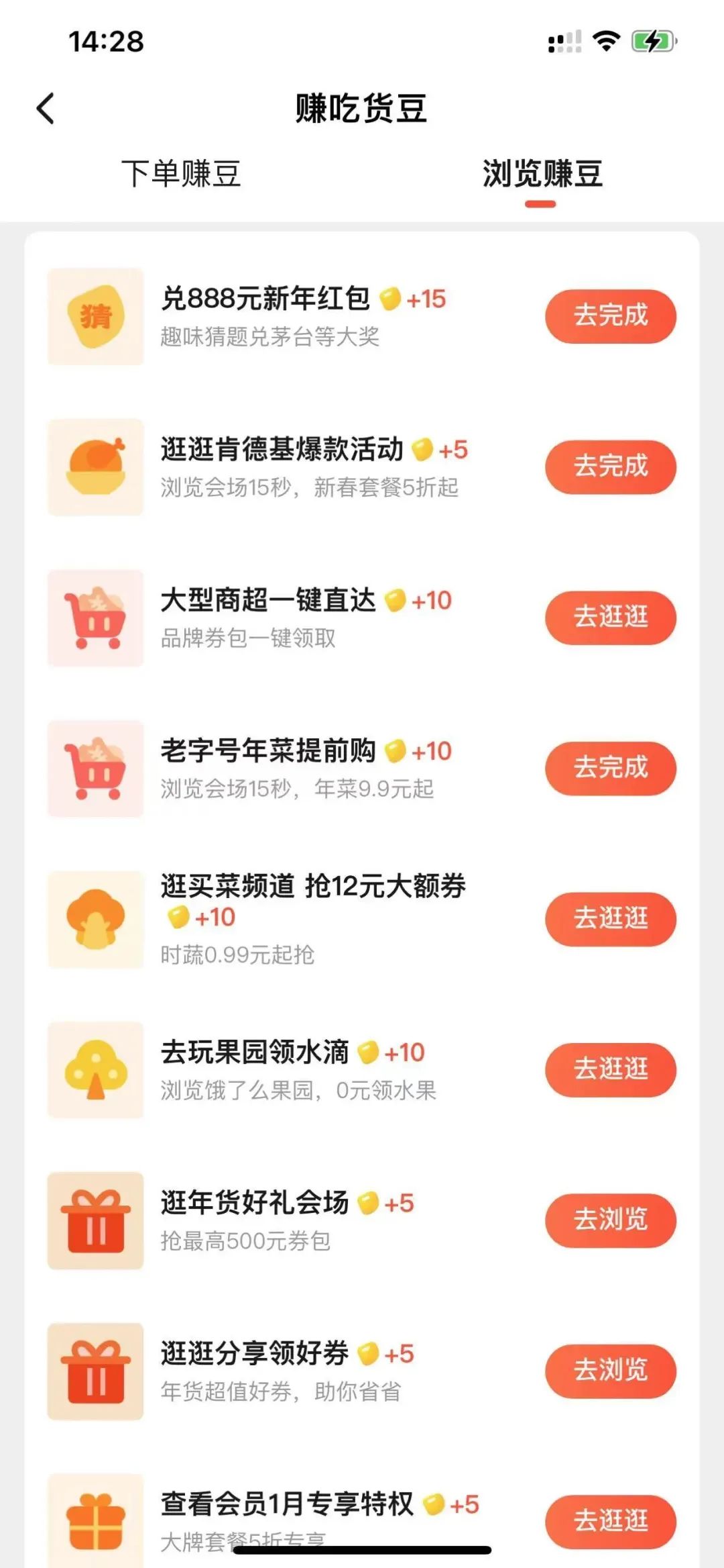 通过浏览奖励吃货豆的方式,利用用户占便宜的心理,刺激用户浏览各项商品的动作与对美食的渴望,联动下单赚豆任务,进一步促进用户下单消费吃好的的欲望。