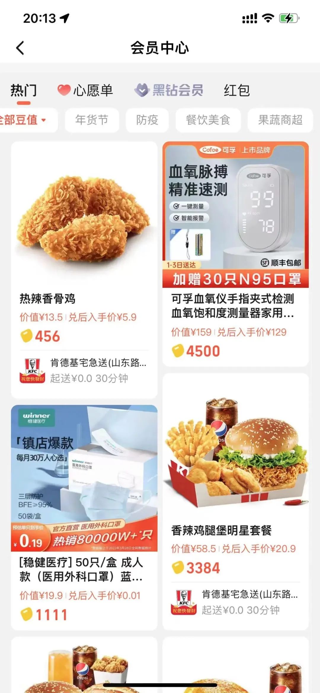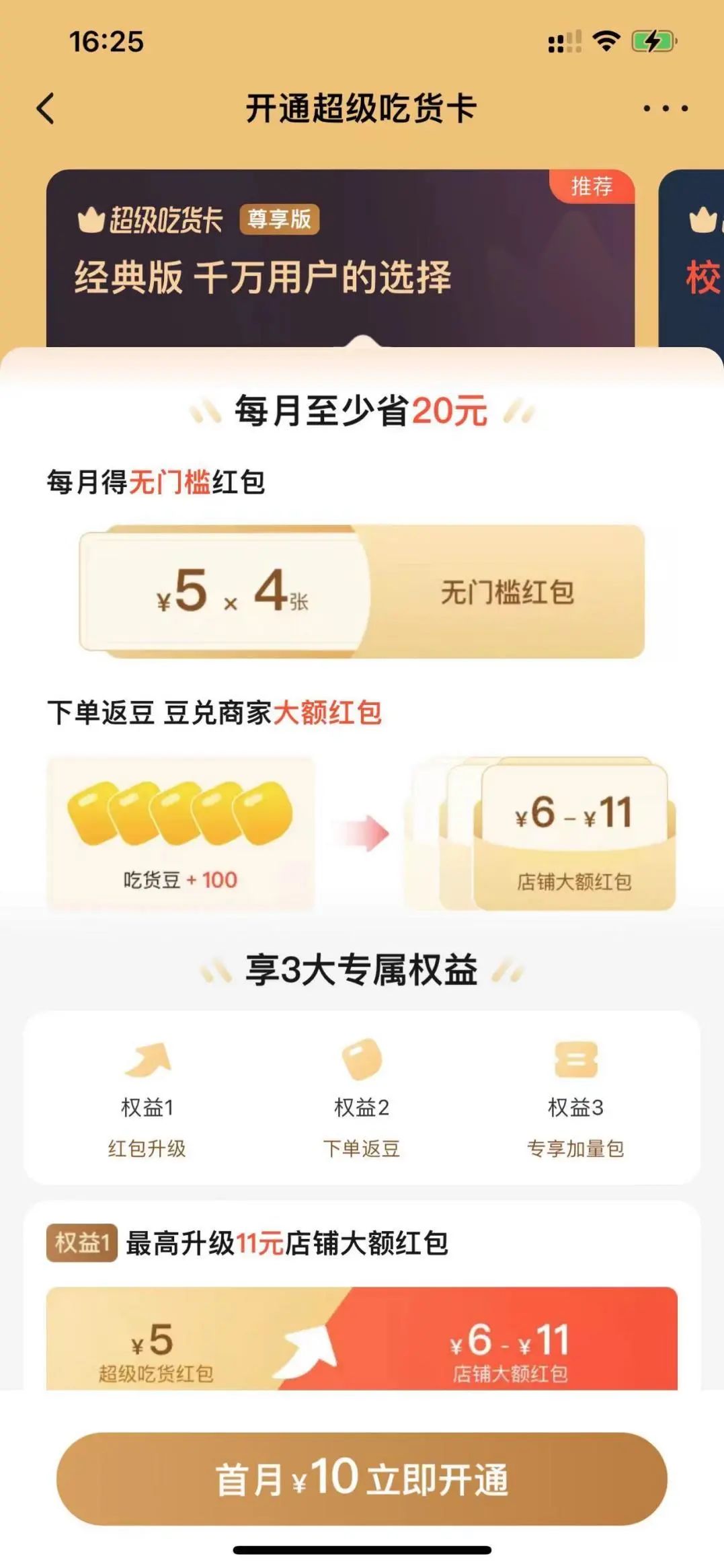 | 会员权益 | 1. 5元无门槛红包:4张2. 下单实付满20元:返100吃货豆(每500吃货豆可兑一张5元无门槛红包)