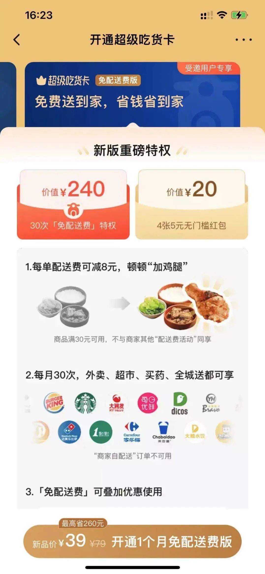 c.会员费(“超级吃货卡” 尊享版:10元/月;免配送费版;39 79元/月)