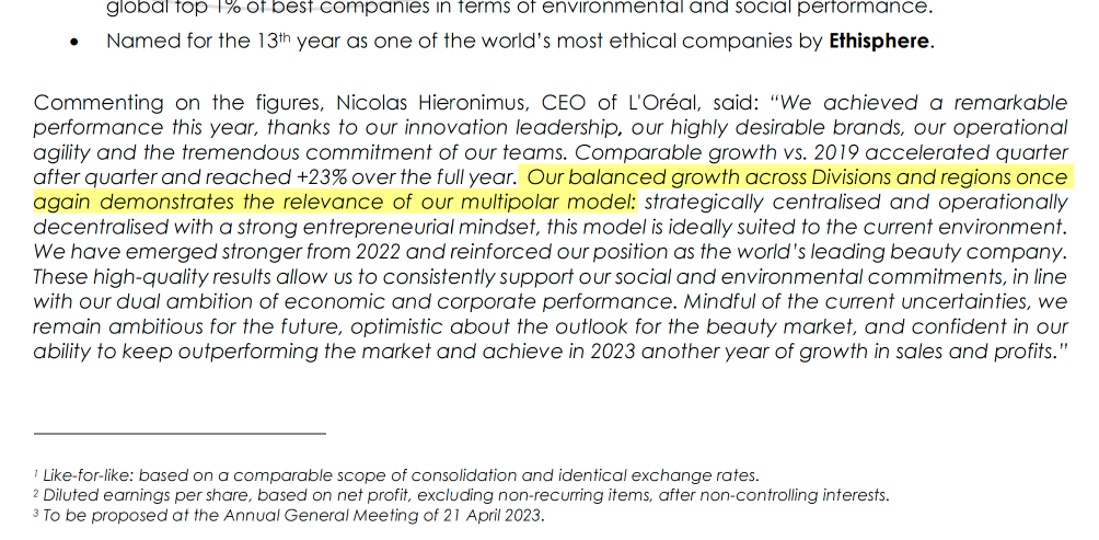 图源:欧莱雅集团2022年财报 叶鸿慕在财报中关于多极模式的发言:我们曾经实现了跨部门和区域的平衡增长,再次证明了我们多极模型的相关性。