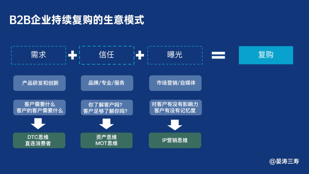 只有把握住需求,才会考虑你的产品,所以任何一个 B2B 的企业,想要让你的客户持续去买你的产品,就必须做到三点:
