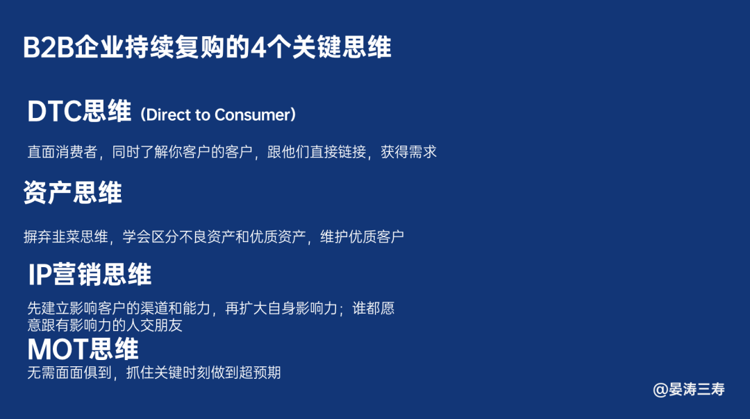 以上就是关于中小B2B企业高效「获客-复购」闭环中提到的两个模型:ABM模型、复购的生意模型,四个思维:DTC思维、资产思维、IP营销思维、MOT思维。今天的分享就到这里。