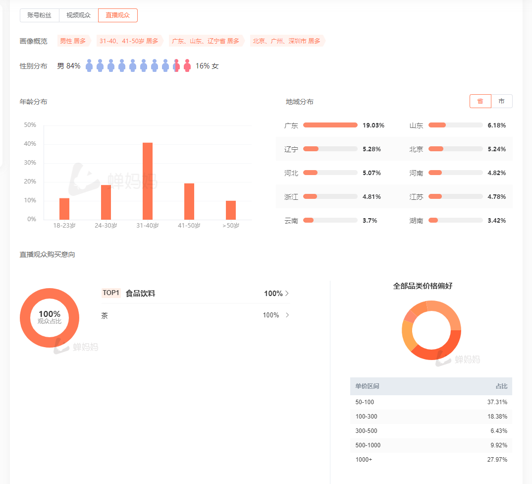 中茶的直播粉丝画像和抖音茶行业有较大出入,整体粉丝群还是趋向于传统茶,更受中老年有消费能力男性的喜爱,对年轻消费者缺乏吸引力。