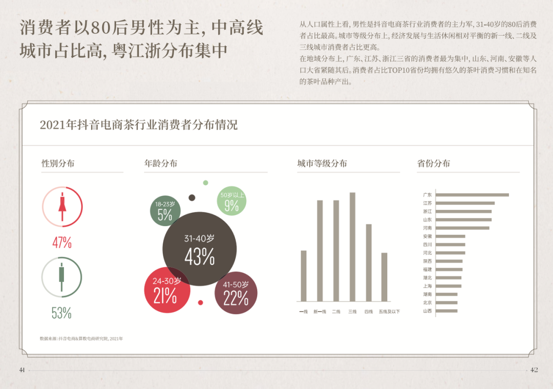 抖音电商茶行业整体交易规模增速亮眼,消费者以80后男性为主,中高线城市占比高,地域产销呈正相关,兴趣圈层效应叠加,茶行业消费者广泛的兴趣偏好为增长带来更多可能。