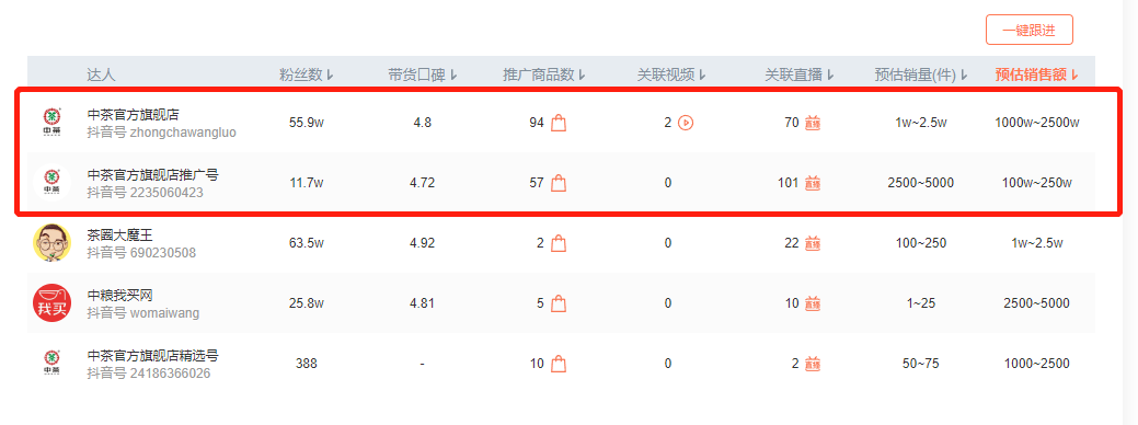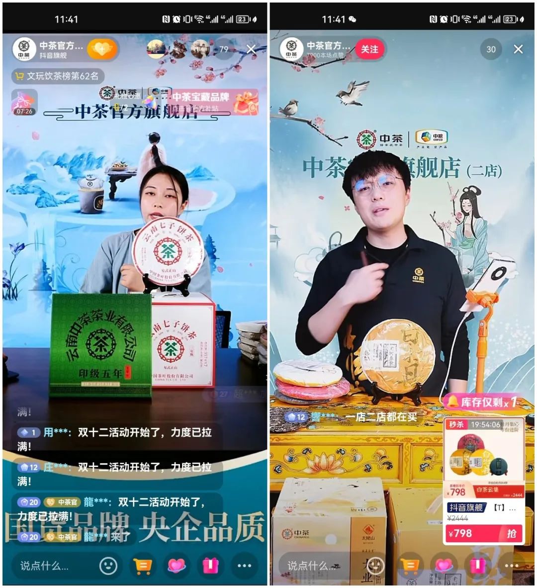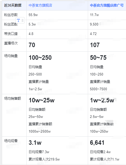 从选品来看两个直播间虽然选择了不同的品类,但都是中茶的明星品类,受众广泛知名度高有一定的用户基础,且一定程度上避免了两个官号打架抢流量的情况。