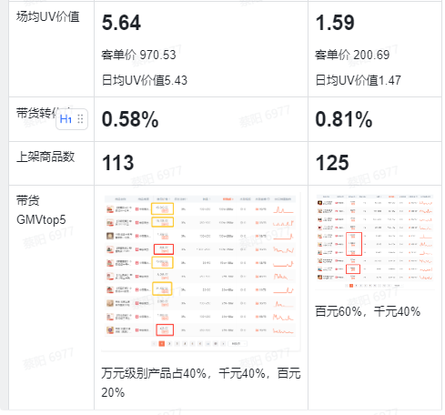 1店组品采用堆数量策略,sku单价基本都在1k以上;2店组品相对数量上没有去做过多叠加,且品类价格也相对较低,因此组品sku单价基本在百元左右。