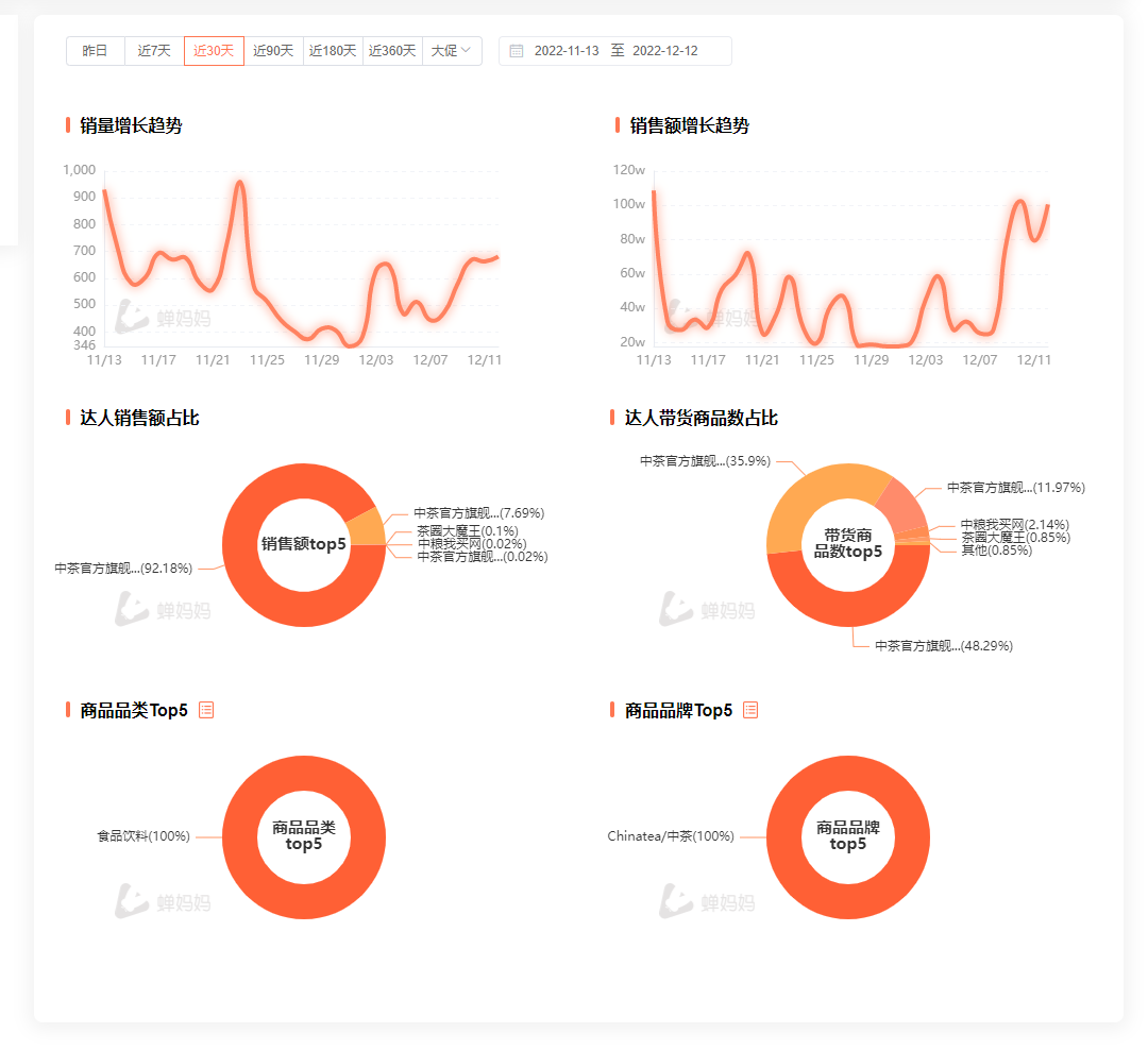 品牌共计关联了7个达人,5个开播,其中99.8%以上销售额产出自中茶官方旗舰店。
