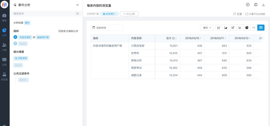 在看板里建立内容的看板,记录我们的文章被阅读数量排名。利用自定义指标或虚拟指标计算出点击率,就可以得到在同样环境下文章的点击率,从而判断出用户喜欢的标题(流量小的内容中心要注意广告引流影响)。