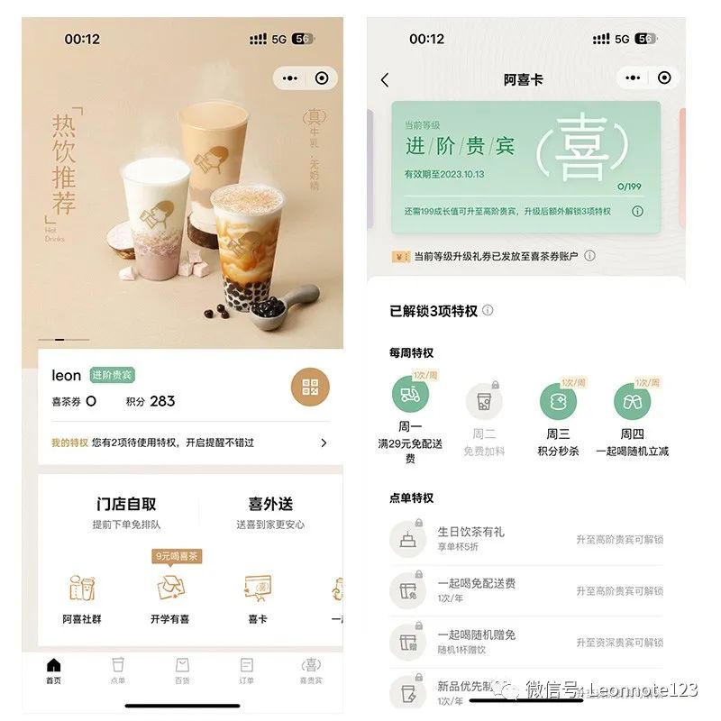 我们从用户分层培养的角度来看,喜茶的会员等级和权益是很巧妙的设计。一方面,会员的成长等级本质上是做深用户的Ltv,在喜茶的见习贵宾和进阶贵宾的等级权益上核心主推免配送费、积分秒杀、免费加料等个人体验服务,刺激的是单个用户的首单消费,提升个人用户的消费用户和ARPU值;但在高阶贵宾和资深贵宾上,权益核心主推第二杯半价、买一赠一、一起喝等权益服务,刺激的是多单多用户消费,在提升个人复购的前提下,挖掘新用户的引入。