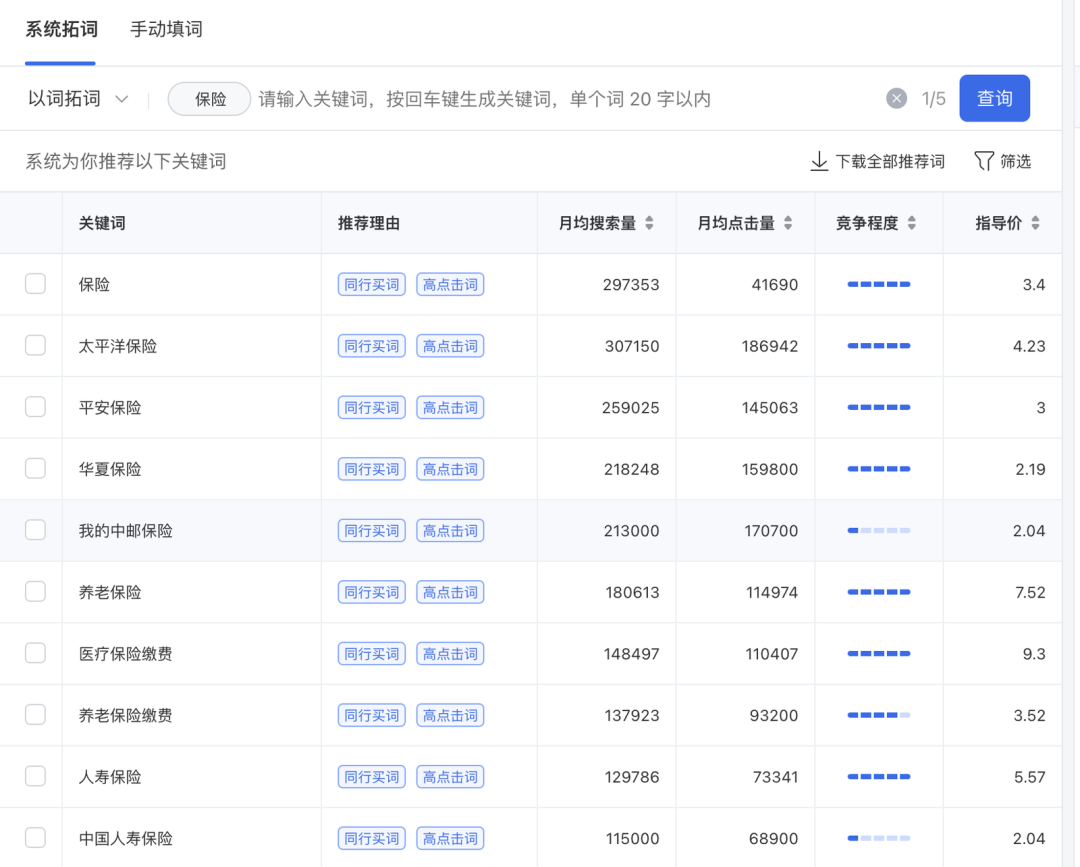 如果你手头上的核心词比较少的话,可以选择「系统拓词」,即系统根据行业和核心词进行拓展,之前文章介绍过,这里就不多加赘述了。