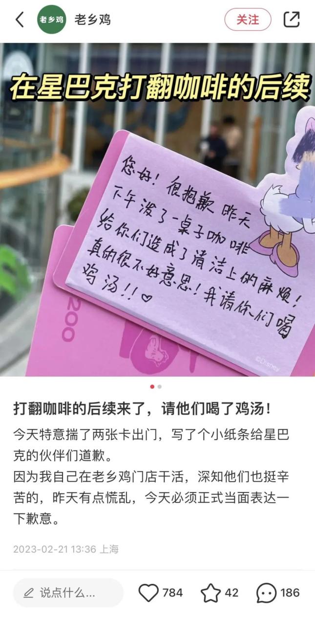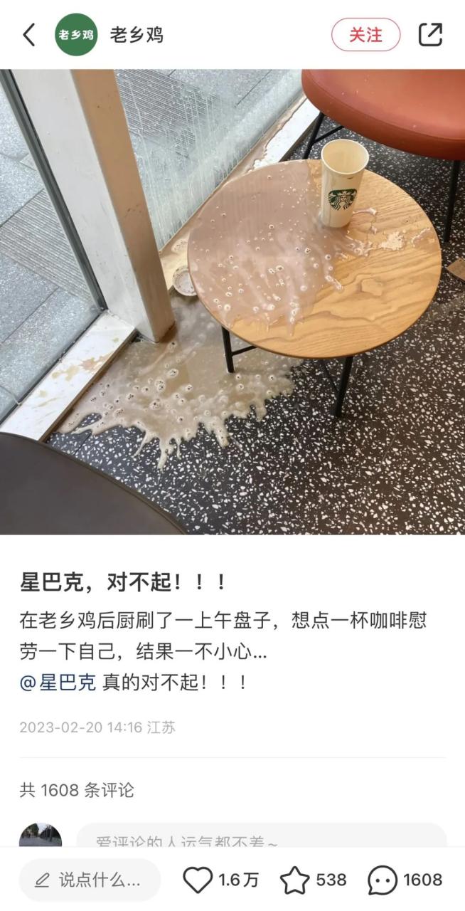 在一个平平无奇的下午,老乡鸡的小红书账号发布了一篇标记生活的笔记,内容是大型的翻车(杯)现场,其笔记标题显示《星巴克,对不起》,文案表示:在老乡鸡后厨刷了一上午盘子,想点一杯咖啡慰劳一下自己,结果一不小心......@星巴克,真的对不起!!!