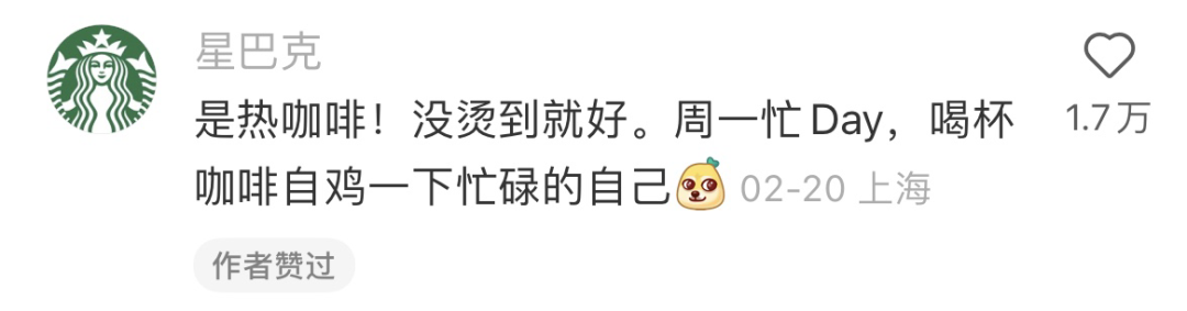 而星巴克在老乡鸡的笔记下回复到,「是热咖啡!没烫到就好。」充满了温度与关怀。而后一句「周一忙Day,喝杯咖啡自鸡一下忙碌的自己」,看似在描述老乡鸡买咖啡的行为,实际上运用了谐音梗与大众热衷于分享生活、悦己经济等内核,让契合年轻人消费心理与习惯的内容感染了更多人。