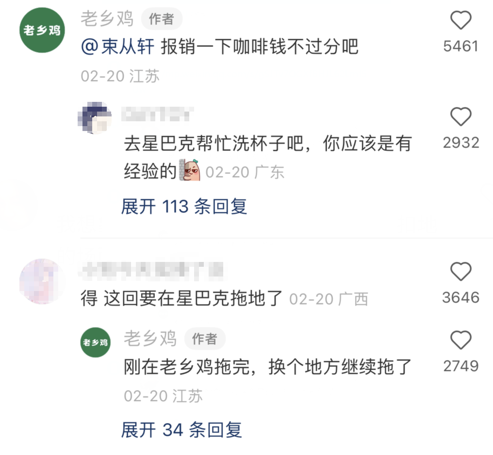 正主之间的互动,顺势点燃了大众的热情,有人建议老乡鸡去星巴克洗杯子、拖地,有人表示咖啡洒地上更提神。