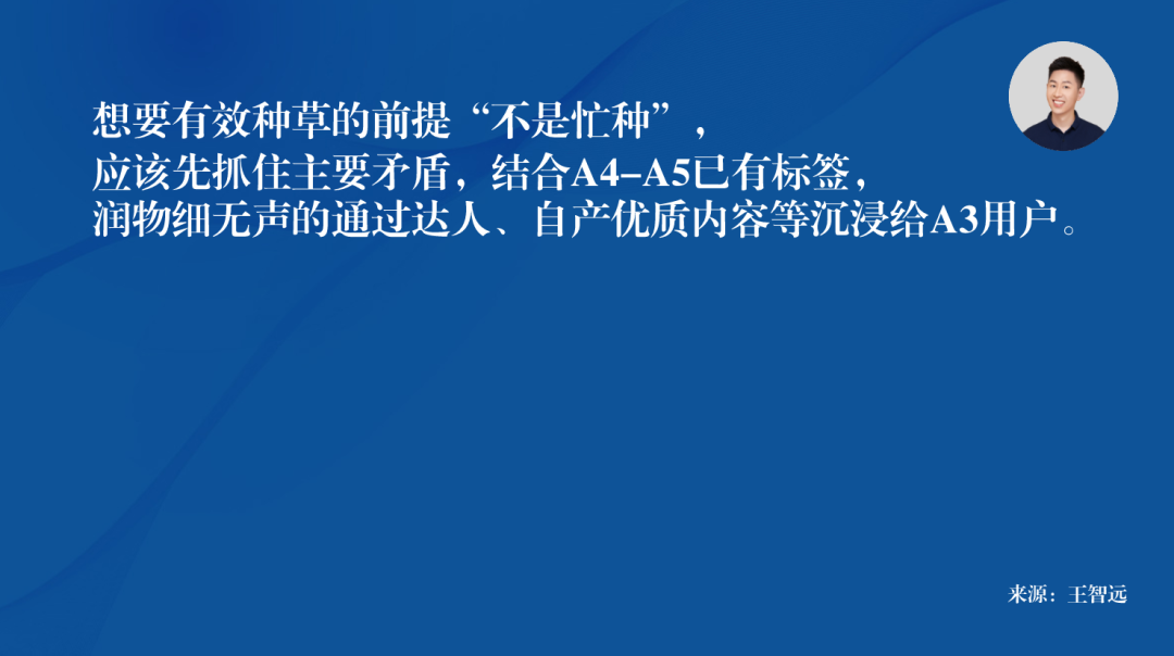 所以,想要有效种草的前提“不是忙种”,应该先抓住“主要矛盾”,结合A4-A5已有标签,润物细无声的通过达人、自产优质内容等沉浸给A3用户,这样种草才起到嫁接作用。