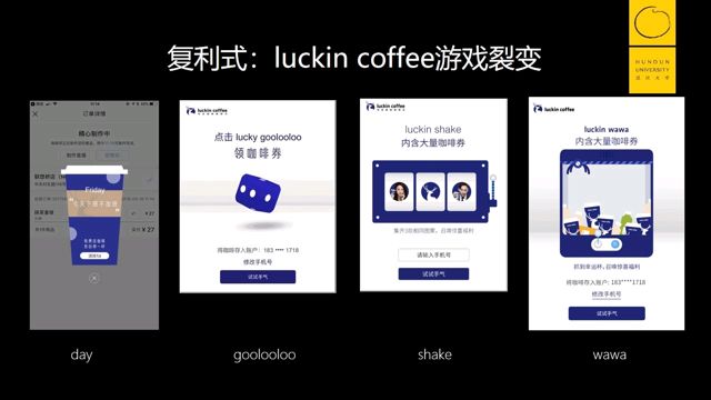 1)复利式,即互惠互利,你好我也好。无论是滴滴、美团、饿了么还是今天的luckin coffee,基本上都是复利式设计。像luckin coffee现在做的裂变很多都是游戏裂变,你可以通过玩一个小游戏获得一张咖啡券,这种形式的分享率非常高。最早像滴滴、美团的那种裂变现在可能大家都已经感到疲劳了,分享率大概只有10%左右,所以要再创新。