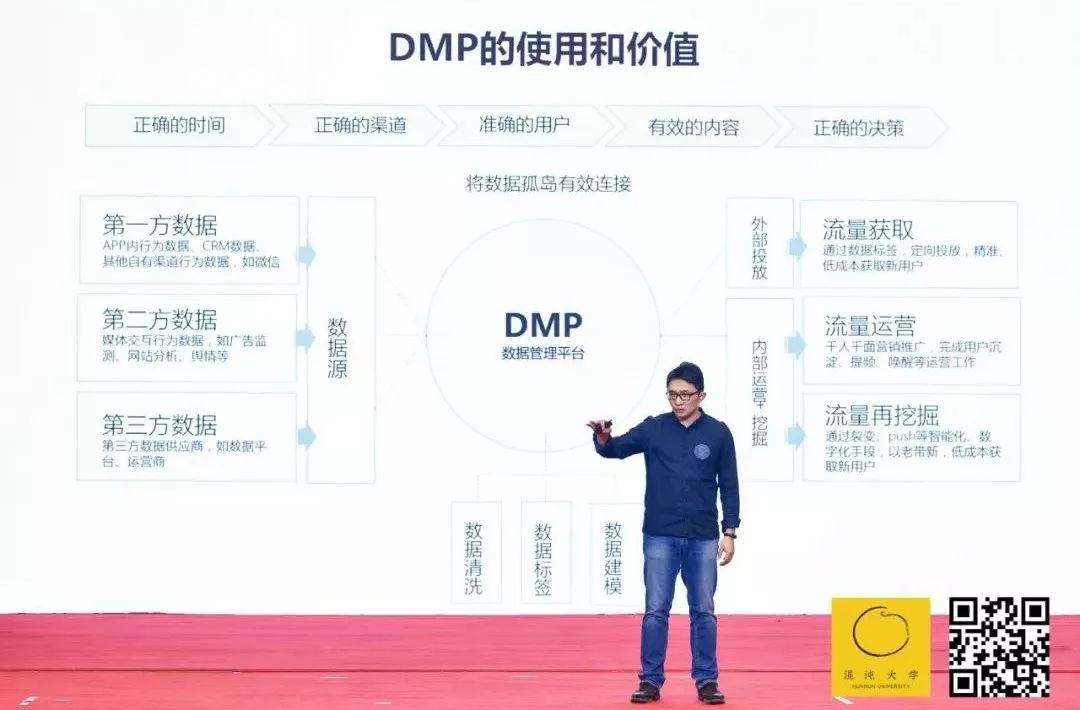 DMP的原理很简单——数据源的抓取,数据的标签化,数据的使用,它支撑整个企业前方的运营和营销。DMP有两个核心的营销价值: