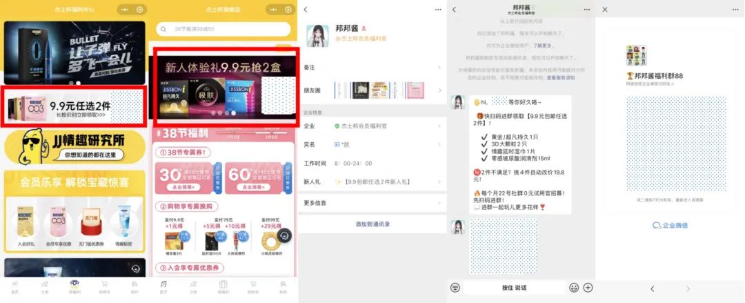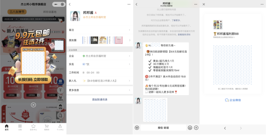 引流路径2:在商城首页/领福利页面,用【9.9元任选2件】新人福利吸引用户,长按即可扫码添加企微【福利官-邦邦酱】。添加成功,企微会自动发送进群二维码。