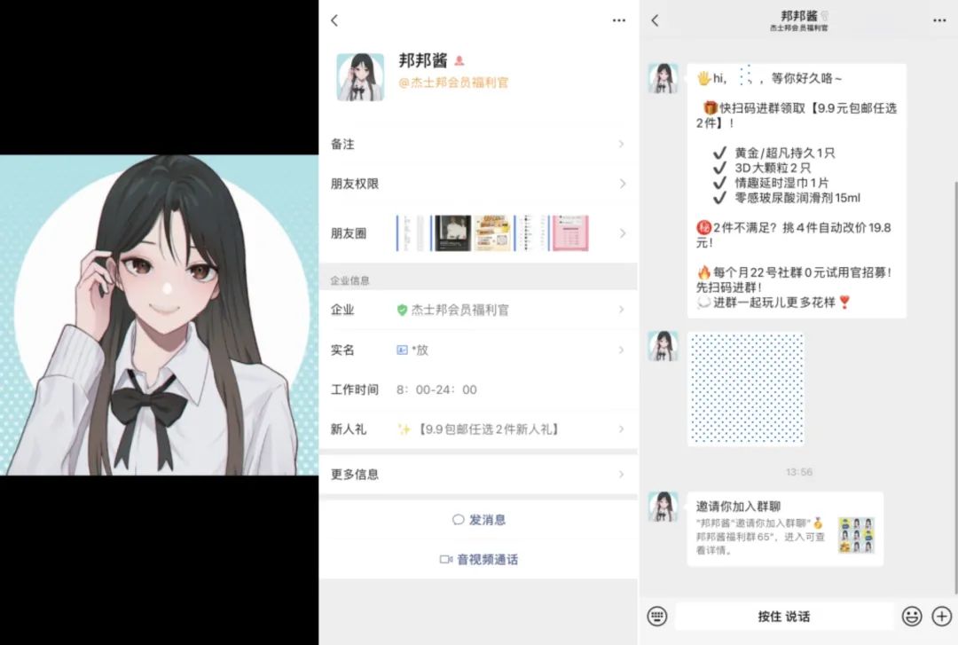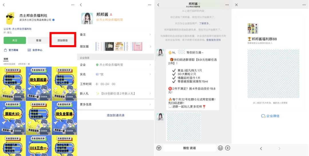 视频号:在【杰士邦会员福利社】的视频号账号中,有设置福利官【邦邦酱】的企微,点击添加后即可入群。
